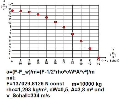 Allerdings verringert sich die Beschleunigung mit zunehmenderGeschwindigkeit, wenn die Antriebskraft konstant bleibt, da die Widerstandskraft aufgrund des "Fahrtwindes" im Medium steigt: